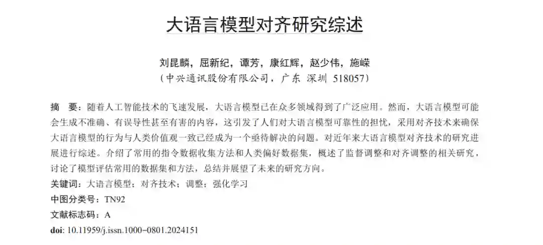 随着人工智能技术的飞速发展,大语言模型已在众多领域得到了广泛应用。然而,大语言模型可能 会生成不准确、有误导性甚至有害的内容,这引发了人们对大语言模型可靠性的担忧,采用对齐技术来确保 大语言模型的行为与人类价值观一致已经成为一个亟待解决的问题。对近年来大语言模型对齐技术的研究进 展进行综述。介绍了常用的指令数据收集方法和人类偏好数据集,概述了监督调整和对齐调整的相关研究, 讨论了模型评估常用的数据集和方法,总结并展望了未来的研究方向。