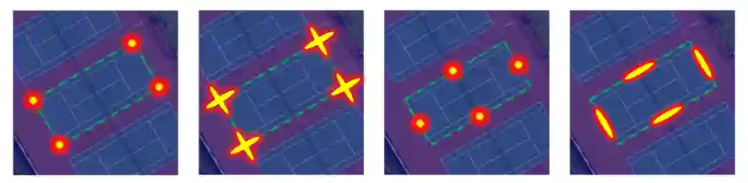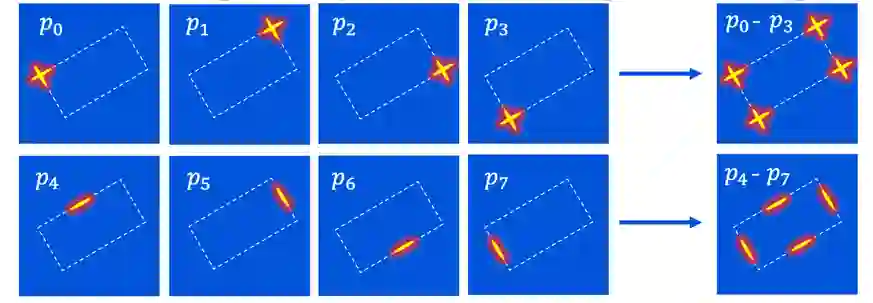 方向敏感热力图 传统的高斯热力图没有考虑到目标的方向和形状信息,该论文提出了一种方向敏感热力图,通过对高斯热力图进行缩放和旋转,来匹配目标的边缘形状,对目标进行更精准的表征,如下图所示。具体表现为,在目标顶点,生成热力图为旋转十字型;在目标边缘中点,生成热力图为旋转一字型,通过对标准高斯分布的空间变换,在目标边缘方向上,高斯核具有更大的方差,使网络能够更加关注边缘方向上的空间特征。