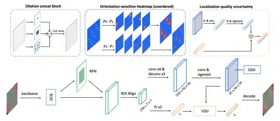 主要内容 Content OSKDet模型框架如下图所示,整体架构基于Grid RCNN,在一阶段,模型回归出目标的最小外接水平矩形,通过ROI Align提取特征后,在二阶段回归目标旋转框上8个关键点热力图来组成旋转目标。整个模型共包含方向敏感热力图、无序关键点表示以及定位质量不确定性模块等三部分。