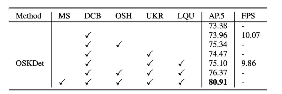 实验部分 Experiments 该论文在多个公开数据集上取得了SOTA的实验结果,在DOTA数据集上的消融实验证明,所提出的方法有效提升了旋转目标检测精度。