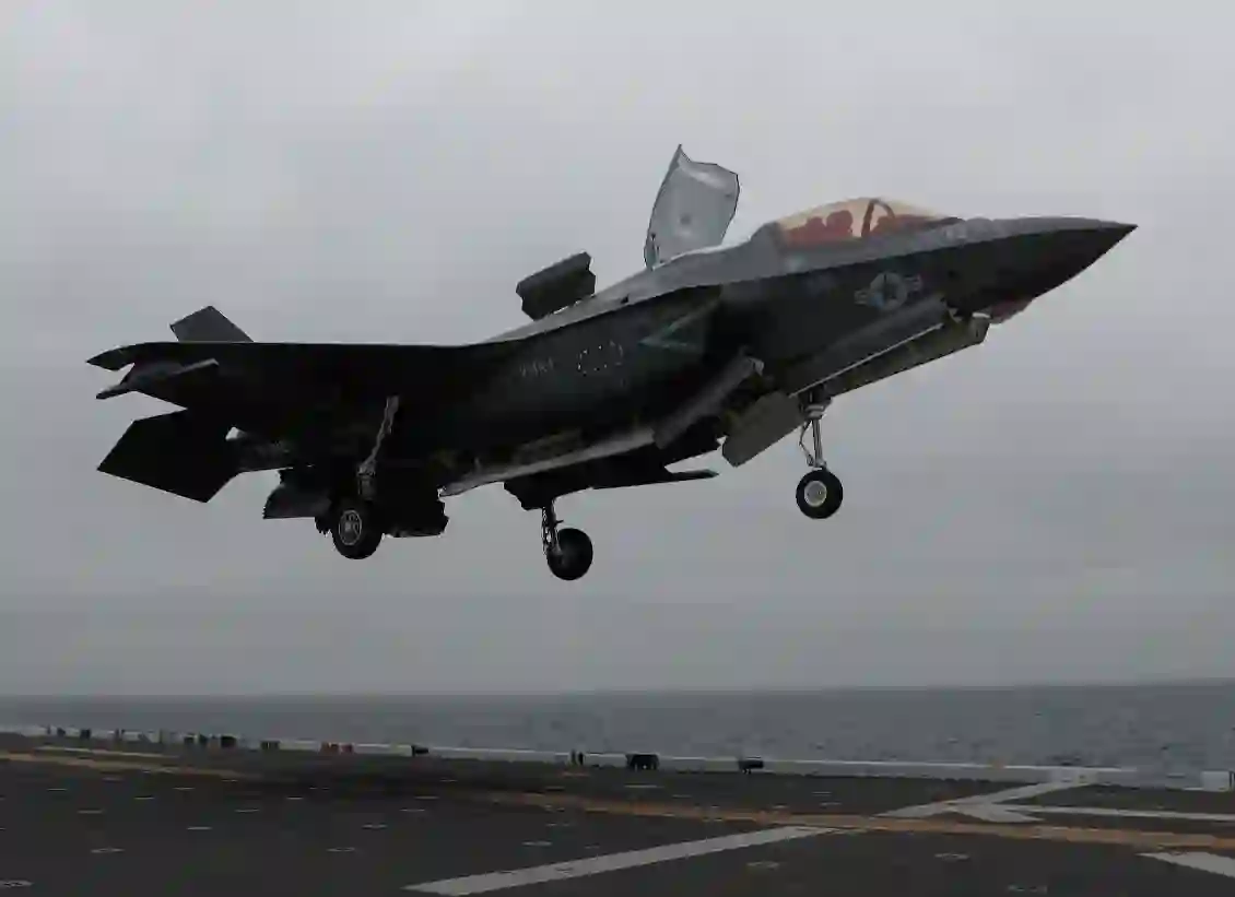 图:3 月 31 日,隶属海军陆战队作战测试和评估中队 (VMX) 1 的一架 F-35B 闪电 II 飞机降落在的黎波里号两栖攻击舰 (LHA 7) 上。VMX-1 作为美国海军陆战队的一部分登上的黎波里号军团的闪电航母概念演示。