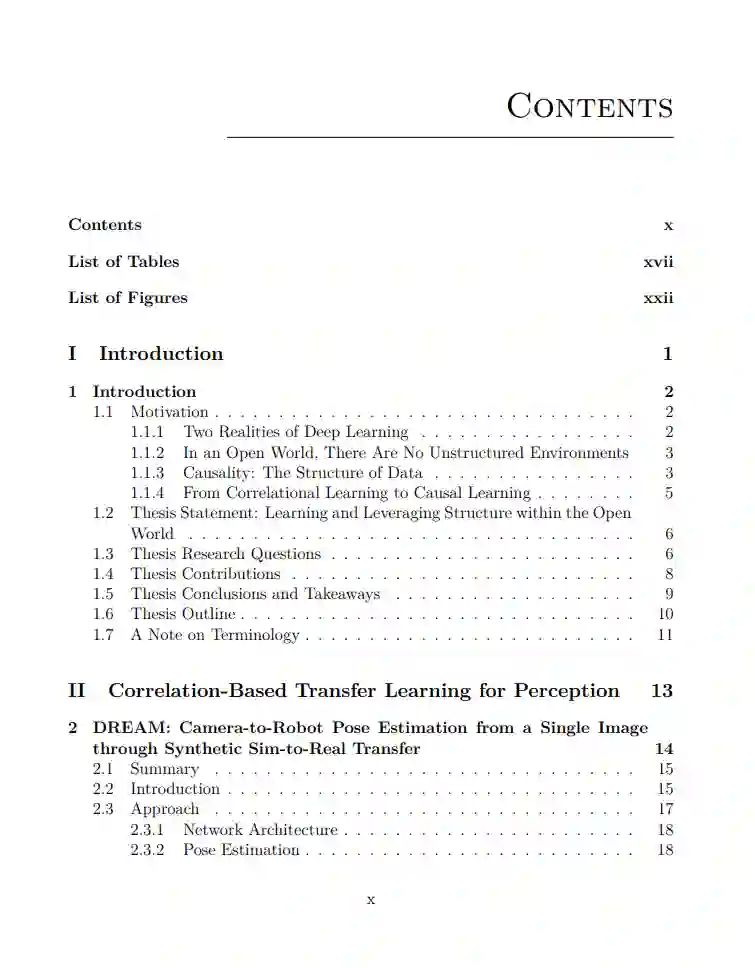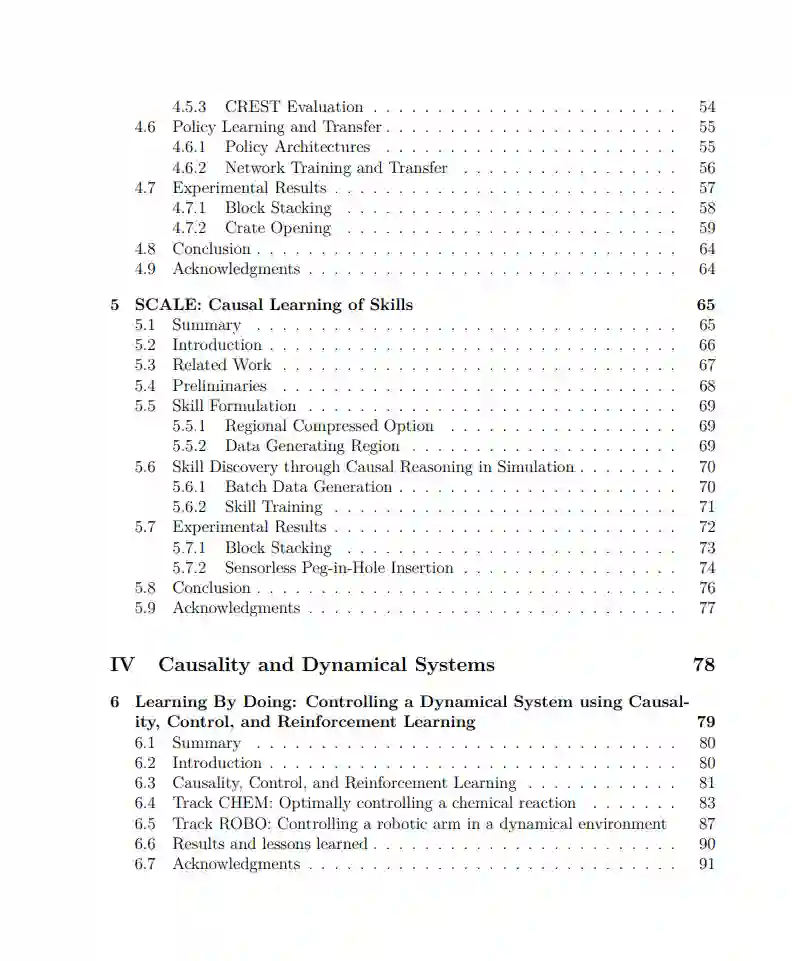 进入人工智能的第三个时代已有二十年,深度学习的兴起带来了两种看似截然不同的现实。在其中一种现实中,深度强化学习、蛋白质折叠和大语言模型等领域取得了巨大成就。然而,在另一种现实中,深度学习赋予机器人在现实环境中可靠操作的承诺仍未兑现。物体的多样性、分布转变和长尾现象:在实验室之外,现实环境对现代统计学习的数据假设提出了挑战。尽管此类环境通常被称为“非结构化”,但这种术语掩盖了它们的本质。现实环境并非“非结构化”,而是由于结构的存在而产生:生成观察数据的潜在因果过程。从这个角度看,机器人不仅应依据数据进行推理和学习,还应理解数据生成过程。这些过程可以通过因果关系的语言形式化。因此,为了学习和利用这些“开放世界”环境的结构,需要新的基于因果关系的机器人学习算法。为实现这一目标,本论文探索了从感知到控制的多种机器人学习问题。首先,我们探讨了如何使用从合成数据到现实数据的转移(如DREAM和FormNet)来学习感知模型。在这些工作中,通过域随机化学习到了相关特征,从而深入了解了如何更直接地使用因果关系来学习结构。为此,我们引入了结构性从模拟到现实的转移,在这种情况下,模拟可以作为因果推理引擎,帮助机器人选择控制策略(如CREST)或技能(如SCALE)的相关特征。通过这种构造,这些策略对无关的分布转变具有鲁棒性,而这些分布转变通常会阻碍基于相关性的深度学习。接下来,通过Learning By Doing(LBD)竞赛和LMeshNet方法,我们探讨了控制、动力系统和因果关系之间的丰富互动,构建了整合潜在信息和语义信息的混合因果世界模型。最后,我们研究了课程学习。在ACL中,我们探讨了人类和代理课程学习的共性和差异。然后,我们运用这些经验教训来进行CURATE:代理如何操纵训练数据的顺序,以有效学习解决特定困难任务的控制策略。因果推理原则在生物医学科学、经济学和基因组学等领域的优势已有目共睹。在机器学习领域,最近有人提出应整合这些原则以利用深度学习,实现因果表示学习。类似地,本论文提出机器人学习领域通过利用因果关系原则也能受益。通过这样做,这一新范式有望使机器人通过因果机器人学习实现操控,从而在开放世界中学习和利用结构。