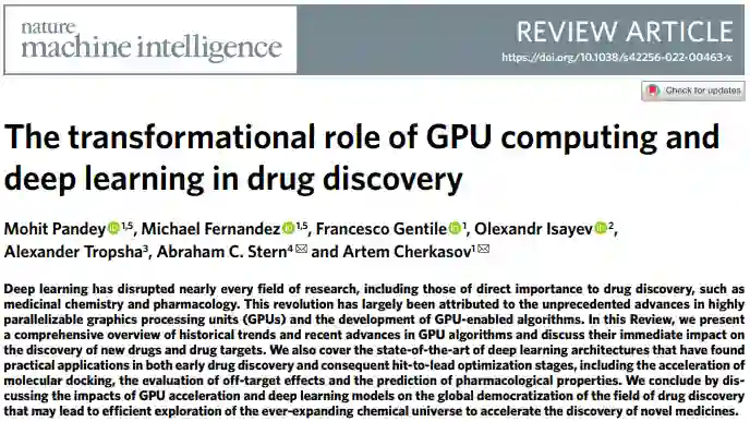 2022年3月23日,来自哥伦比亚大学的Artem Cherkasov和英伟达的Abraham C等人在Nature Machine Intelligence杂志发表文章,全面阐述了GPU计算和深度学习的历史趋势和最新进展,并讨论了它们对药物发现的直接影响。