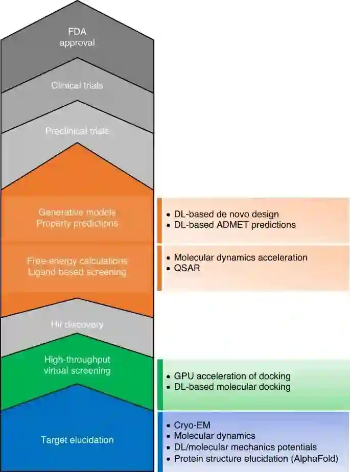 深度学习几乎颠覆了每一个研究领域,包括那些对药物发现有直接重要性的领域,如药物化学和药理学。**这场革命在很大程度上归功于高度可并行的GPU的空前进步和支持GPU的算法的发展。**在这篇文章中,我们全面介绍了GPU算法的历史趋势和最新进展,并讨论了它们对发现新药和药物靶点的直接影响。我们还介绍了最先进的深度学习架构,这些架构在早期药物发现和随后的hit-to-lead阶段都有实际应用,包括加速分子对接、评估脱靶效应和预测药理特性。最后,我们讨论了GPU加速和深度学习模型对药物发现领域的全球民主化的影响,这可能会推动对不断扩大的化学世界的有效探索,以加速发现新药。