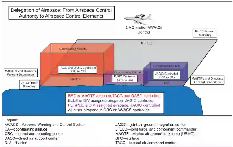 因此,虽然空域管制官保留总体责任,但协调高度以下的具体管制与冲突消除通常委托给在指定空域范围(如空域管制分区、两栖目标区域、高密度空域管制区或部队作战区域)内运作的军种级空域管制单元(空中支援作战中心、控制报告中心或海军陆战队空中指挥控制系统单元),并通过空域管制计划、空域控制命令及军种作战命令等文件进行协调。