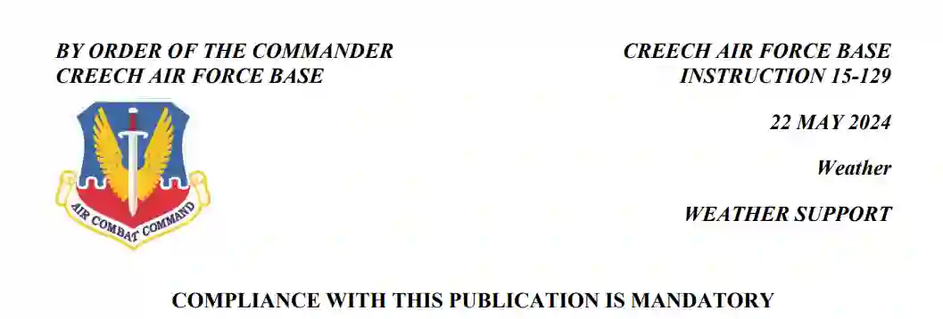 美军432作战支援中队气象飞行队 (432 OSS/OSW) 由多个要素组成。Creech 气象业务单位为 Creech AFB 提供所有气象服务和支持,其职责和程序在本指令中作了规定。432 OSS/OSW 的其他部门为下段作战行动提供气象服务。这些单位的职责和程序已按要求记录在适用的计划/规章或谅解备忘录或协议中,本文件未包括在内。