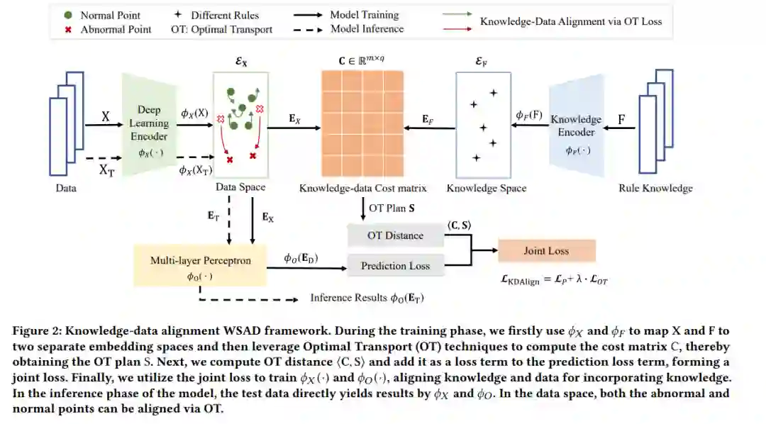 异常检测(AD)在许多基于网络的应用中扮演着关键角色,包括恶意软件检测、反洗钱、设备故障检测以及网络故障分析。大多数方法依赖于无监督学习,由于缺乏标签,难以达到令人满意的检测精度。弱监督异常检测(WSAD)通过引入有限数量的标记异常样本来增强模型性能。然而,对于在标记数据不足的情况下训练的模型来说,泛化到未见异常仍然是一个挑战。在本文中,我们引入了一种新颖的框架知识-数据对齐(KDAlign),以整合人类专家通常总结的规则知识来补充有限的标记数据。具体来说,我们将这些规则转换到知识空间,并随后将知识的整合视为知识与数据的对齐。为了促进这种对齐,我们采用最优传输(OT)技术。然后,我们将OT距离作为额外的损失项加到WSAD方法的原始目标函数中。在五个真实世界数据集上的全面实验结果表明,我们提出的KDAlign框架显著超越了其最先进的对手,实现了跨不同异常类型的优越性能。