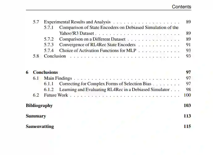 论文的第二部分包括两个章节,涉及偏见对基于强化学习的推荐方法的影响。其第一章重点解决了在模拟器上减轻偏见对强化学习 -基推荐方法的影响,从而实现了对这些方法的学习和评估。其第二章进一步探讨了在使用提出的去偏模拟器进行学习和评估时,用于强化学习 -基推荐方法的不同状态编码器。 https://dare.uva.nl/search?field1=keyword;value1=Reinforcement%20learning;f1-typeClassification=PhD%20thesis;docsPerPage=1;startDoc=9