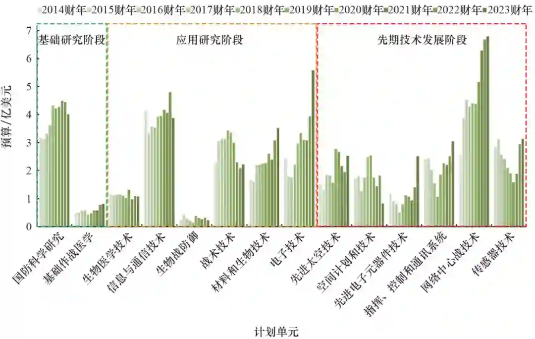 美国国防高级研究计划局(DARPA)作为美国颠覆性技术的孵化器,在美国国防科技创新中扮演着重要角色。本文通过分析2014—2023财年DARPA研究、开发、试验与鉴定(RDT&E)预算经费的发展和变化情况,明晰了美国国防前沿技术创新方向和布局:从横向阶段划分看,基础研究不再是预算近两年的布局重点,预算重心由基础研究向先期技术发展转移;从纵向项目配置看,预算呈现出持续布局前沿技术、推进新技术演示验证、助力“全域作战”体系建设等趋势;从投向的技术领域看,微电子、人工智能、通信与网络以及生物科技是DARPA近2年的研发重点。