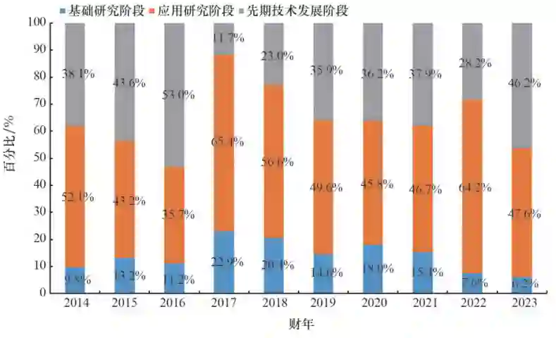 图2 2014—2023财年DARPA计划单元经费投量柱状图 在子项目层面,每3~5年呈现出应用研究新增经费占比大幅降低、先期技术发展新增经费大幅增加的趋势(图3)。