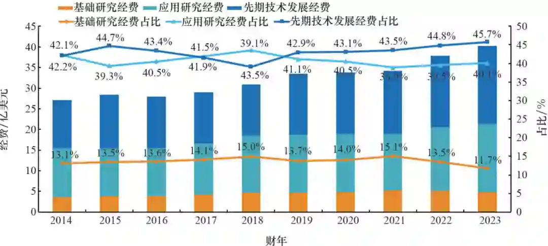 DARPA在每年第一季度会向美国国防部提出科研经费预算申请,旨在对新财年经费支出进行系统规划。DARPA的RDT&E经费预算申请包括4个预算活动阶段,依次为基础研究阶段、应用研究阶段、先期技术发展阶段和管理保障阶段。每个科研活动阶段细分为3个层次,由高到低依次为计划单元、项目群和子项目。基础研究预算支持信息、电子、数学、计算机和材料科学等领域的科学研究和试验,探索这些技术的国防应用潜力。应用研究预算的目标是开发信息与通信、电子、生物等领域的新技术,使其广泛提升军事能力成为可能。先期技术发展预算的目标是开发、展示、评估革命性新技术或新系统,并大幅降低成本,使商业化生产成为可能,以满足当前和未来军事任务。管理保障经费为DARPA的行政费用提供资金支持。基础研究、应用研究、先期技术发展阶段是DARPA预算申请的重点。与陆、海、空三军技术研发部门相比,DARPA的技术研发强调以军方未来潜在需求为目标,坚持以创新为唯一宗旨,始终把精力放在对未来的探索上,致力于发展高风险、高投入、高回报的颠覆性技术和系统。DARPA每年将30亿~40亿美元的预算分配给200多个研究项目,其经费占比不到美国国防部RDT&E预算的4%。 2023财年,DARPA为RDT&E预算申请经费41.19亿美元,较美国国会2014财年申请经费增长43.8%,但总体占国防部RDT&E预算的比例持续下降,从2014财年4.5%跌至2023财年的3.2%,增速低于国防部RDT&E预算(图1)。其中,基础研究申请经费从2014财年(3.65亿美元)到2023财年(4.83亿美元)有小幅增长,但占比总体下降,2023财年基础研究经费仅占RDT&E预算11.7%,占比创10年新低;应用研究申请经费连续2年上涨,2023财年达到16.51亿美元,占总体预算40.1%,近10年的占比先升后降;先期技术发展申请经费连续7年上涨,2023财年达到18.84亿美元,占总体预算45.7%,占比创10年新高。