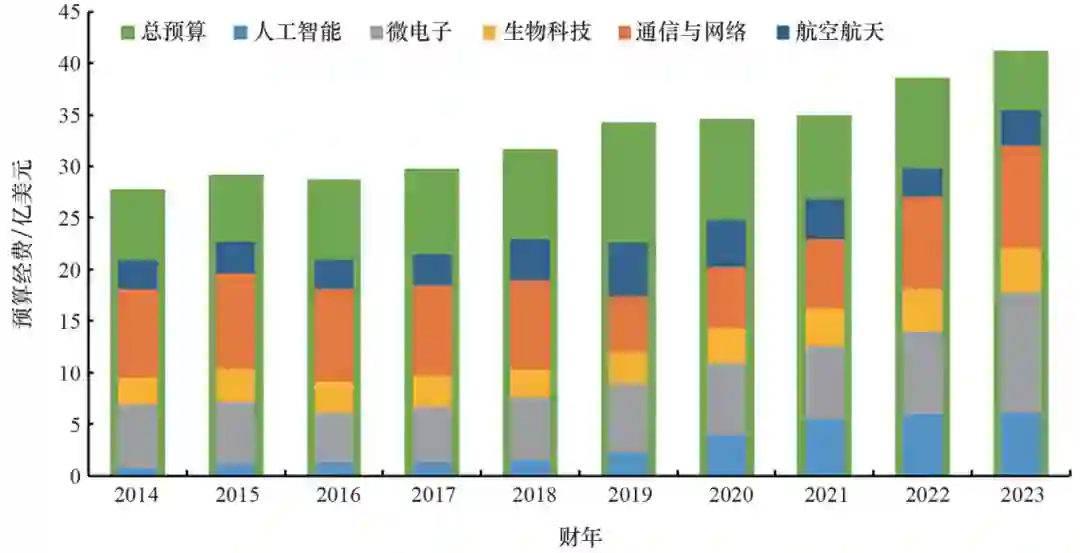 从先期技术发展阶段的布局看,通信与网络、微电子、航空航天、人工智能领域是投入重点。通信与网络先期技术发展经费投量近10年始终保持首位,在2023财年占比达到41.3%(图5)。航空航天领域先期技术发展经费在2019财年达到最高(5.20亿美元),随后逐年下降,2023财年反弹增长至3.35亿美元,占比17.8%(图5)。微电子领域先期技术发展经费在2022、2023财年迎来大幅增长,3年平均增长率为34.0%,2023财年占比28.4%(图5)。人工智能领域先期技术发展经费由2014财年的2400万美元增长到2023财年的2.09亿美元。 通信与网络、微电子、航空航天、人工智能领域合计先期技术发展经费占比在2023财年达到98.6%。先期技术发展经费投量前10名的子项目中,航空航天和人工智能领域子项目占比分别为40%和30%。先期技术发展经费增量前10名的子项目中(新增项目除外),人工智能、航空航天、微电子、通信与网络领域项目占比分别为30%、20%、20%和30%。 结论与启示 主要结论 通过对2014—2023财年预算数据的分析,主要得出以下3点结论:(1)2014财年以来,DARPA大幅增加对人工智能领域和微电子领域的研发投入,微电子领域已超越通信与网络领域,成为DARPA前沿技术布局中的“重中之重”。(2)DARPA现阶段基础研究的预算优先级依次是人工智能、生物科技和微电子,应用研究的预算优先级依次是微电子、生物科技、人工智能、通信与网络,先期技术发展的预算优先级依次是通信与网络、微电子、航空航天和人工智能。(3)整体看,DARPA充分贯彻为美国国家安全创造技术突破和新能力的战略使命,将投资主要集中在微电子、人工智能、生物科技、通信与网络以及航空航天等技术领域,加速推进应用研究和先期技术发展,助力“全域作战”体系建设发展。 美国大力投资这些关键技术领域与美国近年来的国家安全战略和国家发展战略密切相关。国家利益是美国国家安全战略的首要目标,这些技术领域都是目前世界技术革命发展中的前沿技术,谁掌握这些技术、谁就掌握了未来发展的主动权,若这些技术优先在军事领域获得应用,那美国就可以进一步扩大军事优势。此外,从拜登总统上任以来,美国就将保持技术领先作为重要的国家竞争战略,对内出台了一系列法案发展科技,对外拉拢盟友打压竞争对手,如2021年开始一直在酝酿的《2021美国创新与竞争法案》、2022年美国商务部发布的《关键和新兴技术(CET)清单》等,重点关注人工智能、通信、微电子、生物等技术领域。 对中国发展的启示