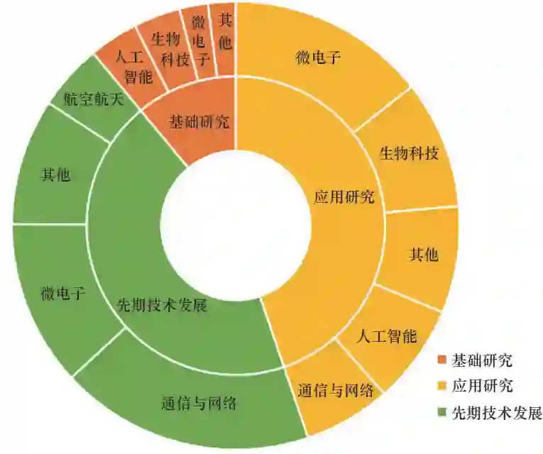 从应用研究阶段的布局看,微电子、生物科技、人工智能以及通信与网络领域成为投入重点。通信与网络领域应用研究经费体量在2018财年之前保持首位,但10年来削减明显,经费占比由2014财年的35.7%下降至2023财年的13.5%(图5)。微电子、生物科技以及人工智能领域应用研究经费近10年增长明显。微电子领域应用研究经费逐年增长,于2019财年超过通信与网络领域、成为应用研究经费投量首位,约5.44亿美元,占比32.9%(图5)。生物科技领域应用研究经费近10年来波动性增长,2023财年达到约3.20亿美元。人工智能领域应用研究经费由2014财年的2933万美元增长到2023财年的2.45亿美元。 微电子、生物科技、人工智能以及通信与网络领域合计应用研究经费占比从2014财年的74.5%增长到2023财年的80.6%。2023财年,应用研究经费投量前10名的子项目中,微电子和人工智能领域子项目占比均为30%。此外,微电子领域子项目新增经费2.52亿美元,占应用研究新增经费的45%。应用研究经费增量前10名的子项目中(新增项目除外),微电子领域子项目占比50%。其中,“先进制造工具”“三维异构集成先进制造方法”“极端环境下电子先进制造”等新增项目专注于先进封装测试技术、复杂三维微系统制造技术以及极端环境电子产品的研发。 先期技术发展阶段分析