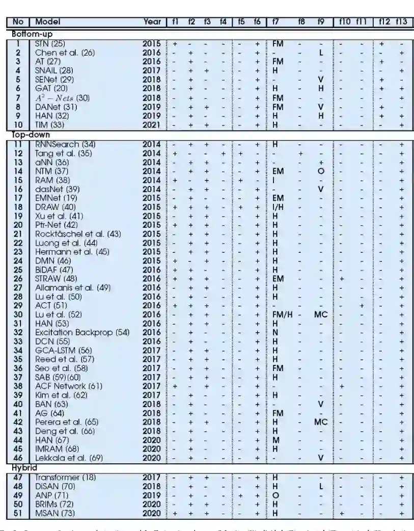 主要神经注意力模型总结。因素依次为: 选择性(f1)、分割(f2)、定向(f3)、持续性(f4)、选择性感知(f5)、选择性认知(f6)、基于位置(f7)、基于对象(f8)、基于特征(f9)、任务导向(f10)、时间导向(f11)、无状态(f12)、有状态(f13)、硬状态(f14)、软状态(f15)。在基于位置的列(f7)中: 隐藏状态/数据嵌入(H)、外部存储单元格(EM)、特征地图(FM)、输入数据(I)和其他(O)。在基于特征的列(f9)中: 视觉(V)、语言(L)、记忆细胞(MC)、隐藏状态(H)和其他(O)。