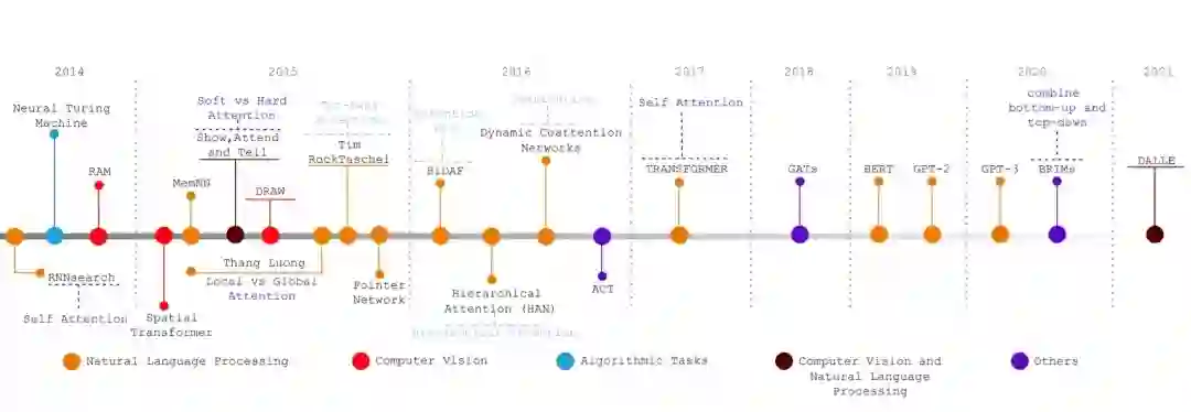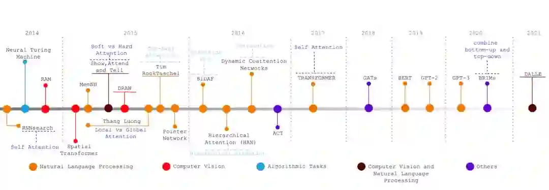 从2014年到现在的主要关键发展。RNNSearch[34]呈现第一注意力机制。神经图灵机[37]和记忆网络[89]引入了记忆和动态流控制。RAM[38]和DRAW[40]学会了将多一瞥、视觉注意力和顺序处理结合起来。空间变换器[25]引入了一个模块,以增加CNN对变化的鲁棒性。展示,参加和告诉[41]创造了多模态的注意力。指针网络[42]将注意力呈现为一个指针。BiDAF[47]、HAN[53]和DCN[55]提出了将数据与不同层次级别对齐的注意力技术。ACT[51]介绍了计算时间的主题。神经变换器[18]是第一个具有端到端注意力方法的自我注意力神经网络。GATs[20]在GNN中引入了注意力。BERT[90]、GPT-2[91]、GPT-3[92]和DALLE[93]是语言模型和文本-图像生成技术的最新进展。最后,BRIMs[72]学会了自下而上和自上而下信号的结合。
