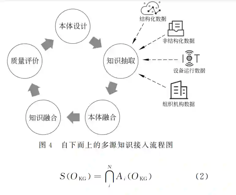 采用自顶向下的知识工程设计方法可快速形成 城市知识图谱本体 (图 3)。依据本体接入多源知 识,包括知识抽取、本体学习融合、数据融合、质量评 价、更新本体。接入的数据一般来源于多部门、多渠 道,数 据 形 式 包 括 物 联 网 数 据、文 本 数 据、视 频 音 频等。 多源知识图谱融合方法分为基于多领域知识图 谱的融合方法和基于多源异构数据的融合方法[15], 将不同领域的知识图谱融合是快速构建知识图谱的 重要方法,不同领域知识图谱的融合方法包括概念 融合、实体对齐、属性对齐和属性值融合等步骤;基 于多源异构数据的融合方法包括基于非结构化抽 取、结构化映射的知识抽取和基于已有图谱的知识 推理以及知识准确率评估等步骤。 通过对接入的子本体、领域本体进行学习、消 歧,实现知识概念的融合,通过质量评价对融合结果 纠正,最终形成知识图谱并更新本体,自下而上的消 息知识接入流程如图 4 所示。在自下而上的过程 中,可以实现本体动态完善流程,最终形成城市场景 下的知识本体。 知识学习采用自下而上子本体互相叠加形成完 整本体,更加符合城市大脑知识图谱建设流程。因 此,若将i个类型本体定义为Ai 则包含所有本体 S(OKG)的定义如式(2)所示。