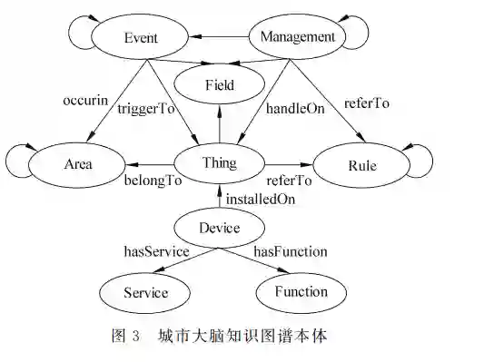 城市大脑的建设运营是解决上述问题的有效方法。其建设理念是将城市中的各类设备、城市部件、 法规政策、事件等要素以一定的方式存储并接入到 城市大脑中,实现城市神经元到城市大脑的连接,构 建 城 市 级 知 识 库,满 足 城 市 管 理 和 市 民 服 务 的 需要[4]。 知识图谱技术将是融合城市多源异构数据的重 要技术手段。知识图谱以资源描述框架(Resource DescriptionFramework,RDF)[5]的 形 式 对 知 识 体 系和实例数据进行统一表示,实现对多源异构数据 的集成和融合。知识图谱同物联网技术一样,在智 慧安防、智慧医疗、智慧交通等各城市领域中具有广 泛的应用[6]。 城市大脑知识图谱具备以下意义:①通过将城 市治理、社会服务、城市事件、民生事件、多领域、多 部门领域知识等多源数据接入知识图谱,形成广泛 的城市大脑知识图谱;②基于城市大脑知识图谱, 通过运用图计算、图匹配、社区发现等算法充分挖掘 数据节点之间的关系,实现对知识的发现、表示、推 理和认识[7],有利于解决城市中的疑难问题;③突 出城市物联网本体和城市事件概念,有效解决知识 图谱构建中的知识可获取问题,增强了知识图谱更新与应用中的主动性;④以城市大脑知识图谱为支 撑的人工智能有助于解决目前人工智能在城市安 防、政务领域中存在的可解释、安全和依赖大数据等 方面的问题。基于对当前技术发展和城市大脑建设 实际情况分析,目标是建设可落地的城市大脑知识 图谱,围绕该目标,该文的主要工作有4个方面: