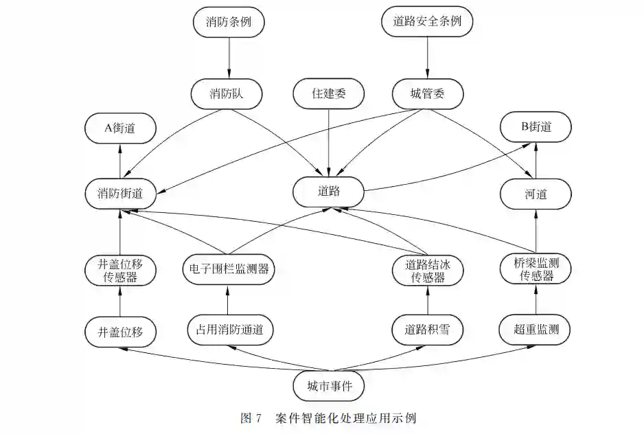 城市大脑知识图谱在案件智能处理中将发挥重 要作用,示例如图7所示。当占用消防车道事件发 生,消防通道传感器(Device)的功能(Function)记 录相关信息,服务(Service)将记录占用者信息并报 警,将 占 用 车 车 牌 等 详 细 信 息 反 馈 给 案 件 管 理 (Management),管理者再根据地址区域(Area)、规 章(Rule)等信息对违章停车事件快速干预处理,做 到未诉先 办。与 此 同 时,市 民 热 线 投 诉 消 防 通 道 占用,通过事 件 抽 取 模 型 将 非 结 构 化 文 本 抽 取 出 事件的 地 址(Area)、事 件 类 型(Field)和 主 体 等 信 息,综合二 者 确 立 案 件 派 发 处 理 人。管 理 方 面 将 会参考(referTo)相关规章制度(Rule)执行相应的 操作。