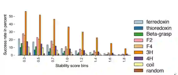 设计折叠家族的评估 使用作者团队的蛋白酶消化试验,不同折叠的成功率不同(稳定性评分>0.5的设计分数)。三个螺旋束通常显示出最高的成功率;这与之前的报告一致。发明的褶皱F2和F4的成功率高于包含α螺旋和β链的自然褶皱;硫氧还蛋白和超螺旋卷曲的四个螺旋束(线圈)最低。