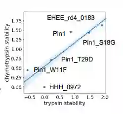 设计蛋白质的高通量评估 作者团队使用酵母表面展示对31500个反映这八个折叠的序列进行了实验表征,包括约2300个随机序列作为阴性对照。为了估计蛋白质稳定性,对酵母上显示的所有设计蛋白质的库进行胰蛋白酶和糜蛋白酶的滴定,并将未分离的蛋白质分类到每个蛋白酶浓度的池中。先前建立了消化蛋白质变体的EC50值与其自由能之间的直接关系。
