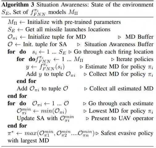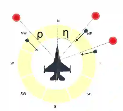 在面临上述多种威胁的情况下,要估算特定方向上特定机动的 MD,我们的步骤如下。首先,我们学习一组预定义的规避机动在不同罗盘方向上的单个威胁的 MD。然后,由于我们需要担心的是最小的 MD,因此我们只需遍历所有威胁,并保存每次机动的最小失误距离。