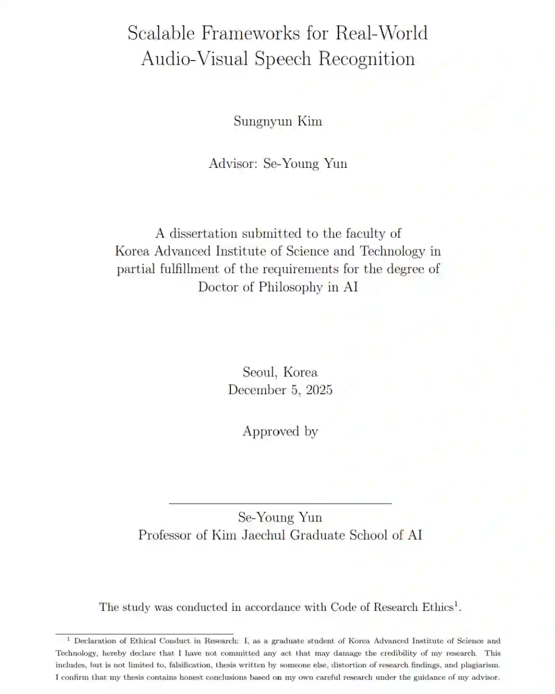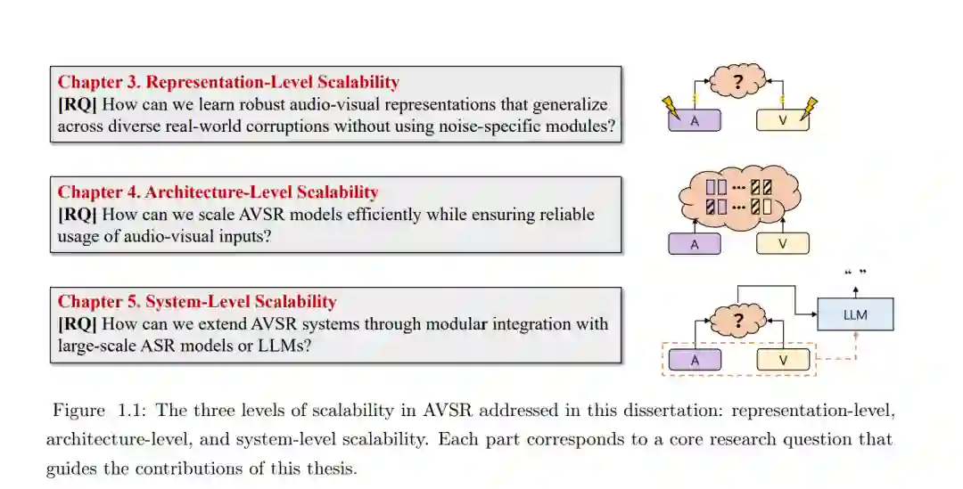 音视联合语音识别(Audio-Visual Speech Recognition,AVSR)系统在实际部署中面临着根本性的挑战:在真实世界环境下,由于不可预测的声学噪声和视觉干扰,其性能往往出现显著退化。本文指出,要克服这些挑战,必须采用一种系统化、分层式的方法,从表示、架构和系统三个层面实现稳健且可扩展的能力。 在表示层面,本文研究了构建统一模型的方法,使其能够学习对多种真实世界扰动具有内在鲁棒性的音视特征表示,从而在无需引入特定场景或任务专用模块的情况下,实现对新环境的有效泛化能力。 在架构层面,针对模型可扩展性问题,本文探索了在保证多模态输入自适应且可靠利用的前提下,高效扩展模型容量的方法,提出了一种能够根据输入特性智能分配计算资源的框架,以提升多模态建模的效率与稳定性。 在系统层面,本文进一步提出通过与大规模基础模型的模块化集成来扩展系统功能的方法,充分利用其强大的认知与生成能力,从而最大化最终的语音识别准确率。 通过在上述三个层面上系统性地提出解决方案,本文旨在构建一套面向下一代的、稳健且可扩展的 AVSR 系统,以满足真实世界应用中对高可靠性的严格需求。 关键词:音视联合语音识别,多模态表示学习,混合专家模型,生成式错误校正,大语言模型